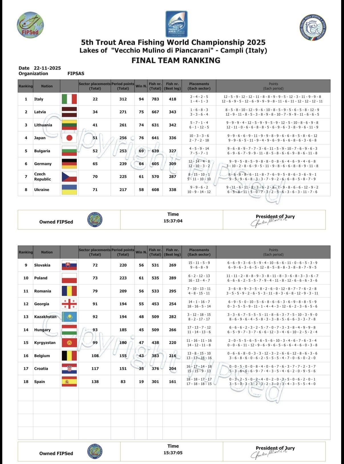 Šis augstais sniegums, kas visiem komandas dalībniekiem ļāva ieņemt vietas individuālā rangā TOP 30, apliecina Latvijas foreļu spiningošanas izlases meistarību un kopējo darbu, kas ieguldīts gatavošanās procesā.