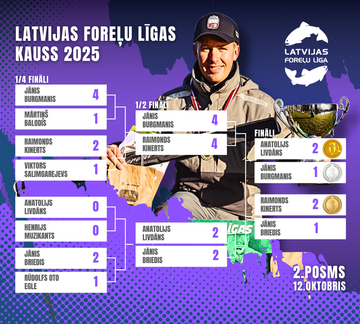 | Dalībnieks | Vieta | Punkti | Zivis | 1 | 2 | 3 | 4 | 5 | 6 | 7 | 8 | 9 | 10 |